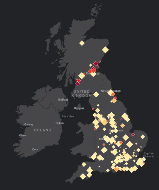 We segmented and refined this data to reveal new insights, such as where our ads were appearing in relation to each branch location. In the visualisation below, yellow represents ad impressions close to a nearby branch while red shows people seeing the ads with no nearby branch and the size of the diamond represents the volume of impressions.