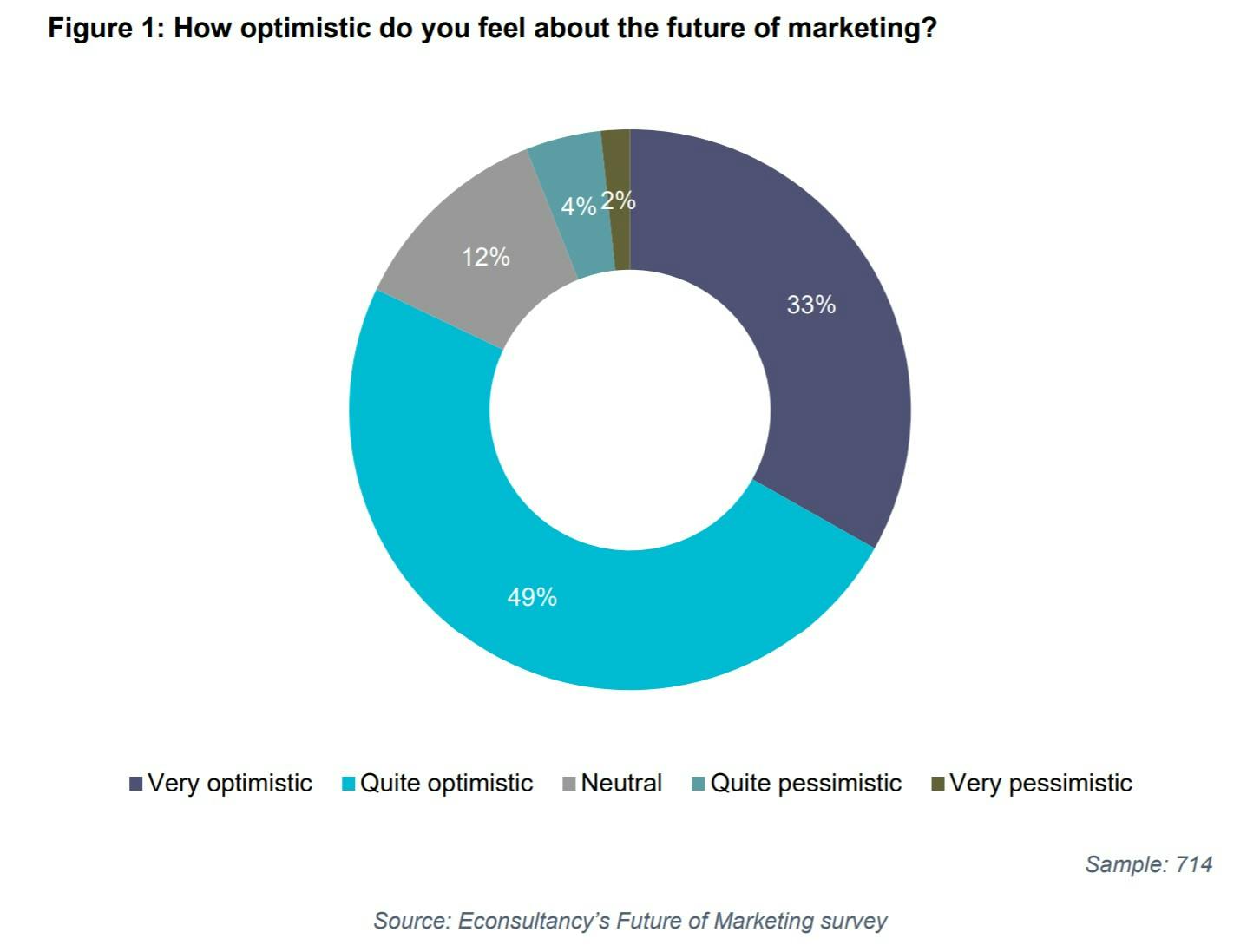 All told, 82% of marketers say they are optimistic about the future of marketing – a third (33%) are “very” optimistic, while almost half (49%) are “quite” optimistic. Twelve percent were neutral on marketing’s future, leaving just 6% who are pessimistic (4% “quite”, and 2% “very”).