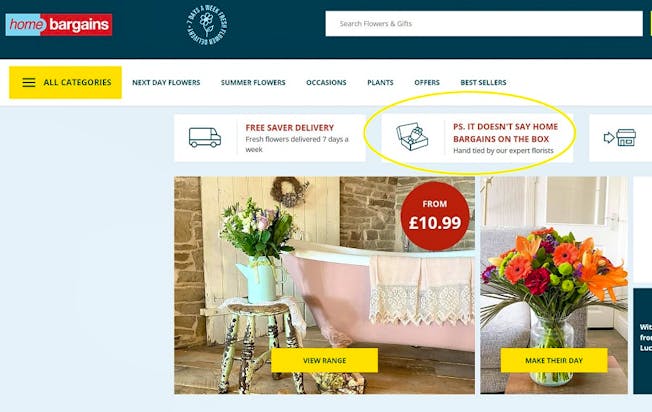 One product category that caught my eye on the Home Bargains website header menu was ‘flower delivery’, which is certainly something that differentiates it from its discount competitors. Click and you’re taken to homebargainsflowers.co.uk, shown below, which is operated by Prestige Gifting.